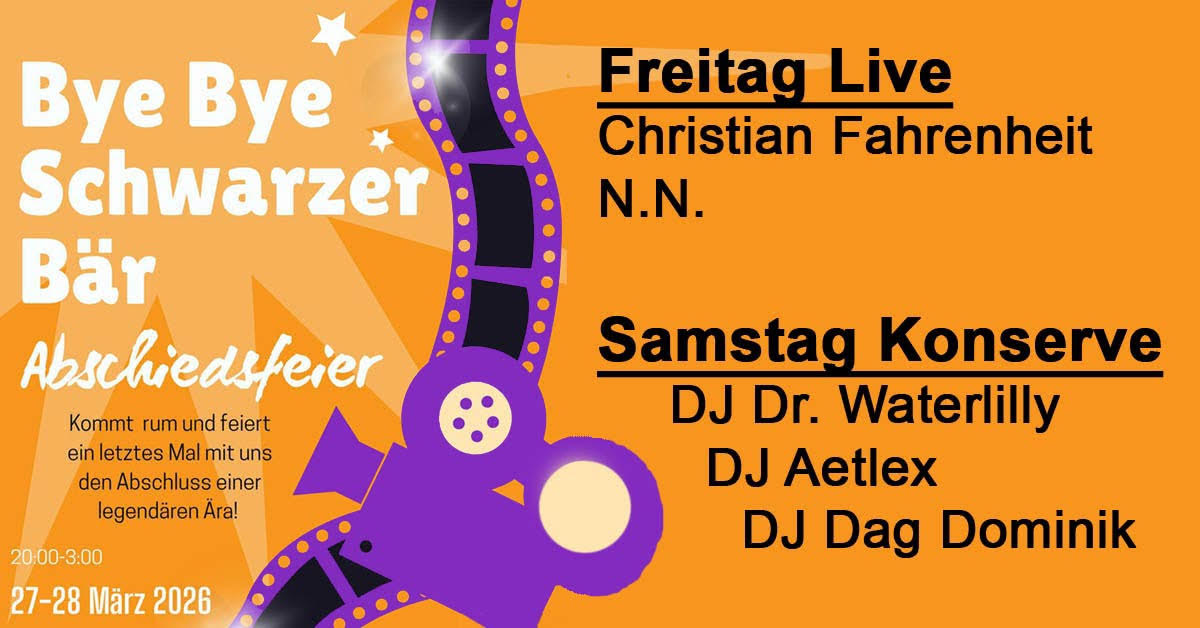 FREITAG – 27.03.2026 | ab 20:00 Uhr BYE BYE SCHWARZER BÄR Das Medienhaus sagt Tschüss zum Schwarzen Bären.Bevor wir weiterziehen…